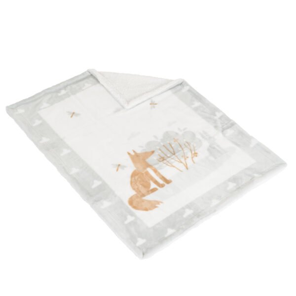 Batanije për foshnje e kthyeshme me një dizajn simpatik pylli në tone të buta pastel. Njëra anë është bërë nga 100% poliester i butë, ndërsa ana tjetër është bërë nga material Sherpa i ngrohtë dhe komod. Ngjyrat pastel krijojnë një atmosferë të qetë dhe komode. E paketuar në një kuti dhuratë elegante. Madhësia: 80×110 cm. E lahet në lavatriçe në 30°C.
