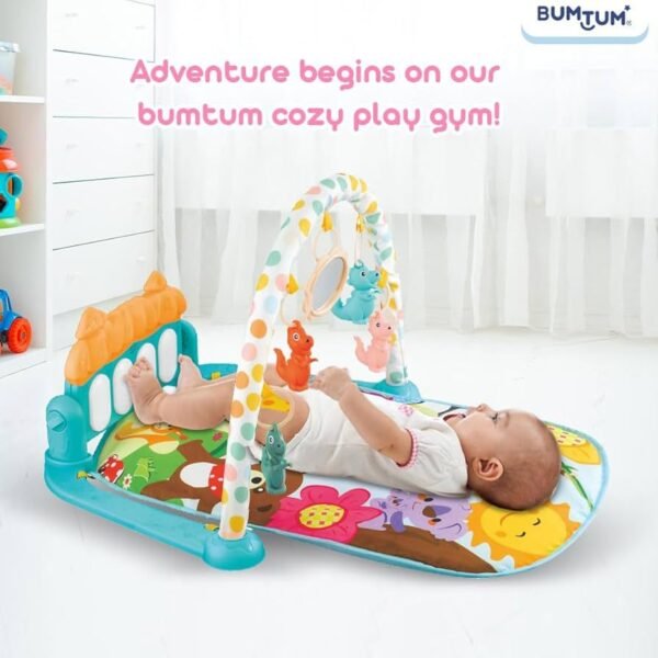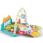 E pajisur me një piano interaktive me tinguj argëtues, një hark me lodra të varura shumëngjyrëshe dhe ngjyra të ndezura që mbështesin perceptimin vizual.