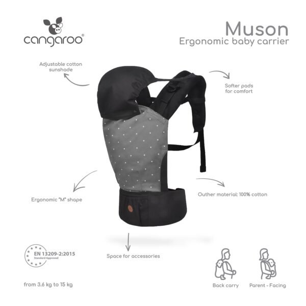 Mbartësi i foshnjës Muson është i përshtatshëm për foshnje të moshës 5 muajsh dhe deri në 15 kg. Pjesët kryesore dhe kapuçi janë bërë prej 100% pambuku. Mund të përdoret në dy pozicione – përballë prindit ose në shpinë. Ka rripa shpatullash të rregullueshëm, një rrip beli të përforcuar dhe një tokëz sigurie të dyfishtë për sigurinë e foshnjës. Një xhep për aksesorë dhe një kapuç i shkëputshëm ofrojnë komoditet dhe rehati shtesë. Produkti është i lehtë për t’u mirëmbajtur dhe i përshtatshëm për larje me dorë