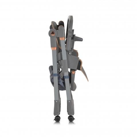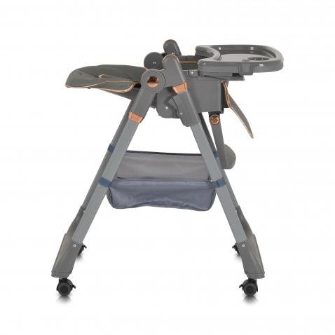 Për fëmijë nga 6 + muaj dhe pesha maksimale deri në 15 kg. Palosja në një karrige mbështetëse me një buton shtypës. Ulësja e madhe jashtëzakonisht e rehatshme me bazë të lëvizshme prej lëkure ECO me cilësi të lartë për pastrim të lehtë. 7 pozicione lartësie. Tabaka rregulluese e ushqimit të dyfishtë me 3 pozicione dhe majën e lëvizshme për pastrim më të lehtë. Mbështetëse e rregullueshme e këmbës-3 pozicione për lartësinë dhe këndin. 2 pikë kajishii me 5 pika me jastëk të butë në shpatulla. Sistemi i ri i pavarur lehtëson palosjen dhe mbajtjen e një karrige të lartë.