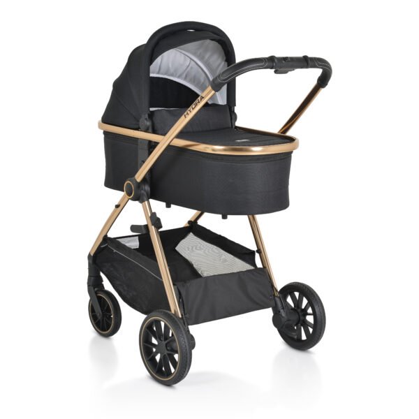 I përshtatshëm për foshnje nga 0+ muaj deri në 22 kg. Çmimi i mësipërm është për karrocën me krevat dore, sedilje verore, adaptorë MAXI-COSI për sediljen e makinës, jastëk gjumi, mbulesë shiu dhe rrjetë mushkonjash. Kreu i karrocës është me mbulesë për këmbët, jastëk të butë gjumi, tendë të rregullueshme. Sedilja verore është me mbulesë për këmbët dhe tendë të rregullueshme me dritare. Detajet: Kornizë alumini; Dorezë me lëkurë të zezë PU të qepur me dorë; Rrota të përparme të rrotulluara 360° – 7 inç. Rrotat janë me sistem të veçantë thithës goditjesh për çdo terren.; Rrota të pasme – 10 inç; Parakolp i lëvizshëm përparmë prej lëkure PU; Shportë aksesorësh; Korniza e karrocës është prej alumini. Maksikoz e cila shtrihet me e pershtatshme per beben tuaj