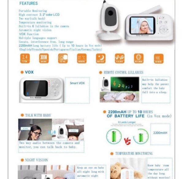 Kamera e foshnjës me funksion të zbulimit të temperaturës dhe shfaqje në kohë reale në Monitor LCD, për të siguruar që fëmija juaj të qëndrojë në një ambient komod dhe të sigurt gjatë gjithë kohës. Kamera e foshnjës ka mikrofon dhe altoparlantin me ndjeshmëri të lartë të integruar, siguron një audio të qartë të dyanshme. Ju lejon t’i jepni foshnjës tuaj një përgjigje në kohë kur fëmija juaj ka nevojë për nënën. Vendoseni foshnjën tuaj në gjumë me ninullat polifonike të para-programuara. Operohet në distancë nga njësia mëmë. Një vizion i gjerë e bën nënën të dijë qartë se çfarë po ndodh. Vizioni i natës infra të kuqe i monitorit video të foshnjës siguron që ju mund ta shihni fëmijën tuaj qartë gjatë natës. Me funksionin VOX, videoja do të mbyllet nëse nuk zbulohet tingull dhe do të zgjohet automatikisht kur foshnja qan ose zbulon tingull tjetër. Jepni gjumë efektiv dhe gjithashtu kursim të energjisë