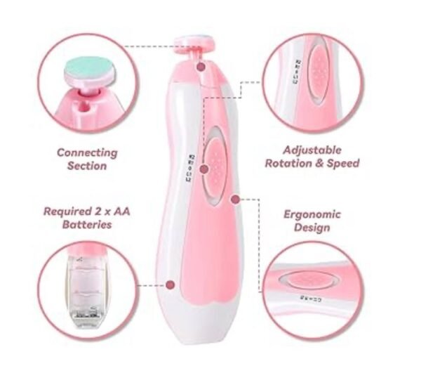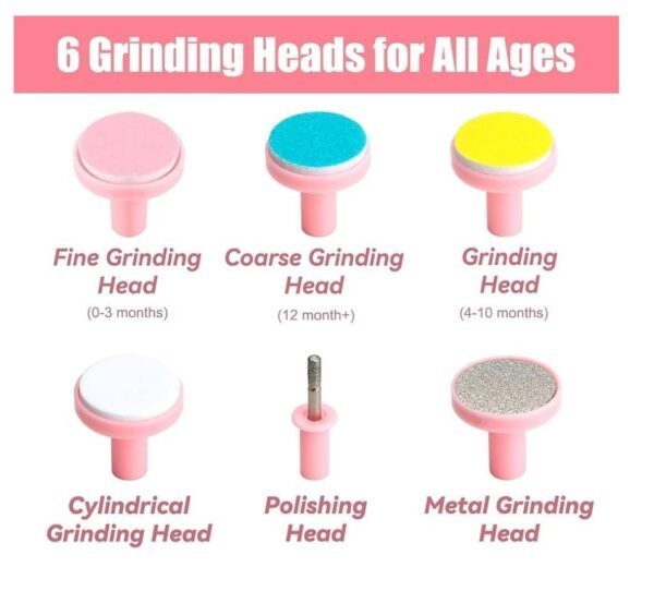 Koka të shumëfishta limimi të përfshira – Vjen me 4 koka limimi të ndërrueshme (ekstra të buta, të buta, normale, të trasha) për t’iu përshtatur trashësisë së thonjve të foshnjës në çdo fazë rritjeje.