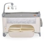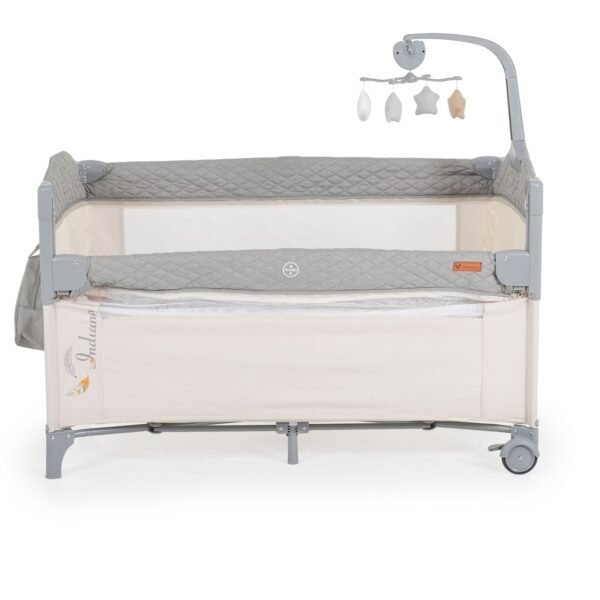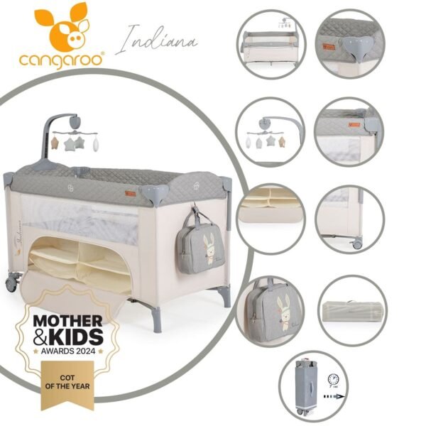 Krevati i udhëtimit për fëmijë “Indiana” është i përshtatshëm për fëmijë nga 0+ muajsh dhe me peshë maksimale deri në 14 kg. Niveli 1: I përshtatshëm për fëmijë nga 0 deri në 6 muaj. Niveli 2: I përshtatshëm për fëmijë nga 6 deri në 36 muaj. Me anë të rënies; Celular muzikor me 4 lodra të buta. Organizues i madh i brendshëm për ruajtje me zinxhir përpara për akses të lehtë. Çanta kompakte pelenash – mund të merrni me lehtësi gjithçka që ju nevojitet për të voglin tuaj në lëvizje.