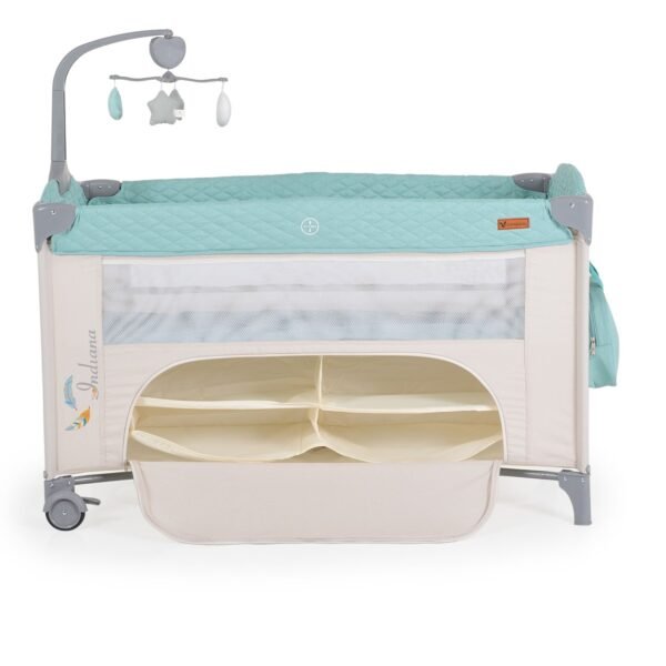 Krevati i udhëtimit për fëmijë “Indiana” është i përshtatshëm për fëmijë nga 0+ muajsh dhe me peshë maksimale deri në 14 kg. Niveli 1: I përshtatshëm për fëmijë nga 0 deri në 6 muaj. Niveli 2: I përshtatshëm për fëmijë nga 6 deri në 36 muaj. Me anë të rënies; Celular muzikor me 4 lodra të buta. Organizues i madh i brendshëm për ruajtje me zinxhir përpara për akses të lehtë. Çanta kompakte pelenash – mund të merrni me lehtësi gjithçka që ju nevojitet për të voglin tuaj në lëvizje.