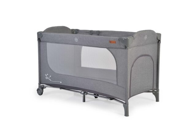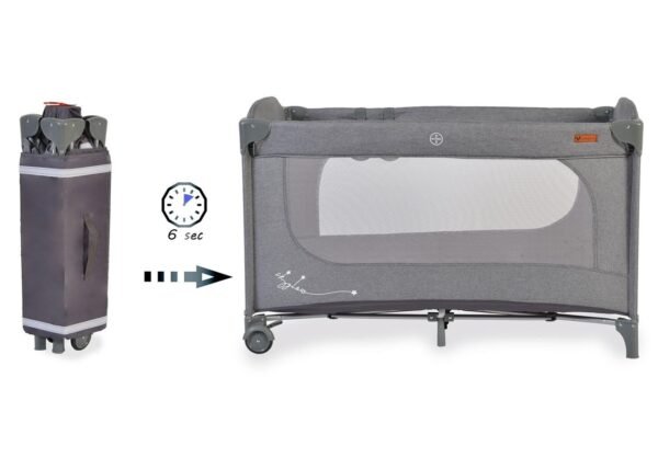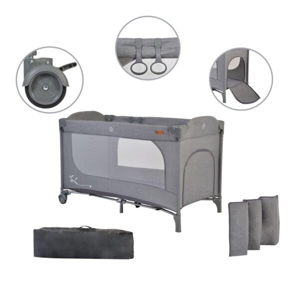 Krevat udhëtimi në ngjyrë gri me hapje zinxhir anash, i përshtatshëm për bebe që nga lindja Ngarkesa maksimale 14 kg, 2 rrota me frena për lëvizje të lehtë Dy dritare të mëdha rrjetë për të monitoruar fëmijën tuaj Futje e butë dysheku 1,5 cm e trashë, 2 unaza për kapjen ose varjen e lodrave Çanta praktike për ruajtje, ideale për shtëpi apo për pushime