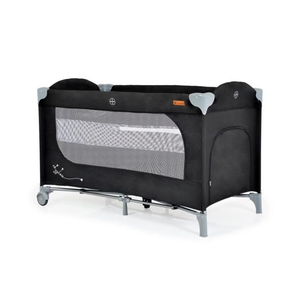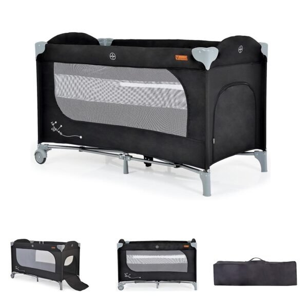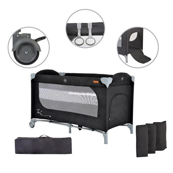 Krevat udhëtimi në ngjyrë gri me hapje zinxhir anash, i përshtatshëm për bebe që nga lindja Ngarkesa maksimale 14 kg, 2 rrota me frena për lëvizje të lehtë Dy dritare të mëdha rrjetë për të monitoruar fëmijën tuaj Futje e butë dysheku 1,5 cm e trashë, 2 unaza për kapjen ose varjen e lodrave Çanta praktike për ruajtje, ideale për shtëpi apo për pushime