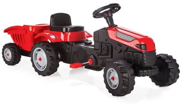 Traktor për fëmijë me rimorkio nga fabrika e famshme Pilsan, i bërë prej plastike cilësore, të qëndrueshme, është zgjedhja më e mirë për të voglin tuaj. Një lodër që padyshim do ta kënaq fëmijën tuaj me modelin e saj. Rrotat e mëdha që kalojnë lehtësisht në terrene jo te rrafshta, një sedilje të rregullueshme, panel instrumentesh dhe sirenë e bëjnë ngasjen emocionuese dhe të lehtë. Për fëmijë nga 2 deri në 7 vjeç. Kapaciteti deri në 50 kg. Seli e rregullueshme e Patentuar (6 faza) që përshtatet me lartësinë e fëmijës. Patentuar montimi i kontrollit me rotacion të thjeshtë. Produkti nuk përmban përbërës të rrezikshëm për shëndetin e fëmijëve. Përmasat: gjerësia 48.5 x gjatësia 143 x lartësia 51
